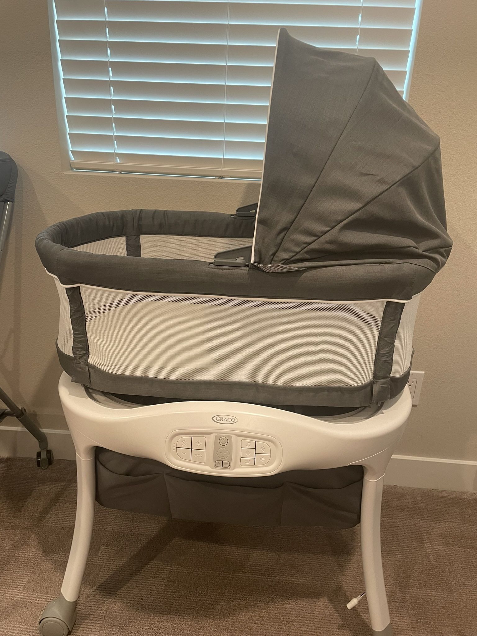 Almost new - this bassinet rocks and vibrates and has various songs and sounds. It saved us with a newborn and was the only thing that put her to sleep at night. We bought a new one once we moved and only used it for a month or so. Almost new. Graco Sense2Snooze Bassinet with Cry Detection Technology | Baby Bassinet Detects and Responds to Babys Cries to Help Soothe Back to Sleep, Ellison, 19 D x 26 W x 41 H Inch (Pack of 1)