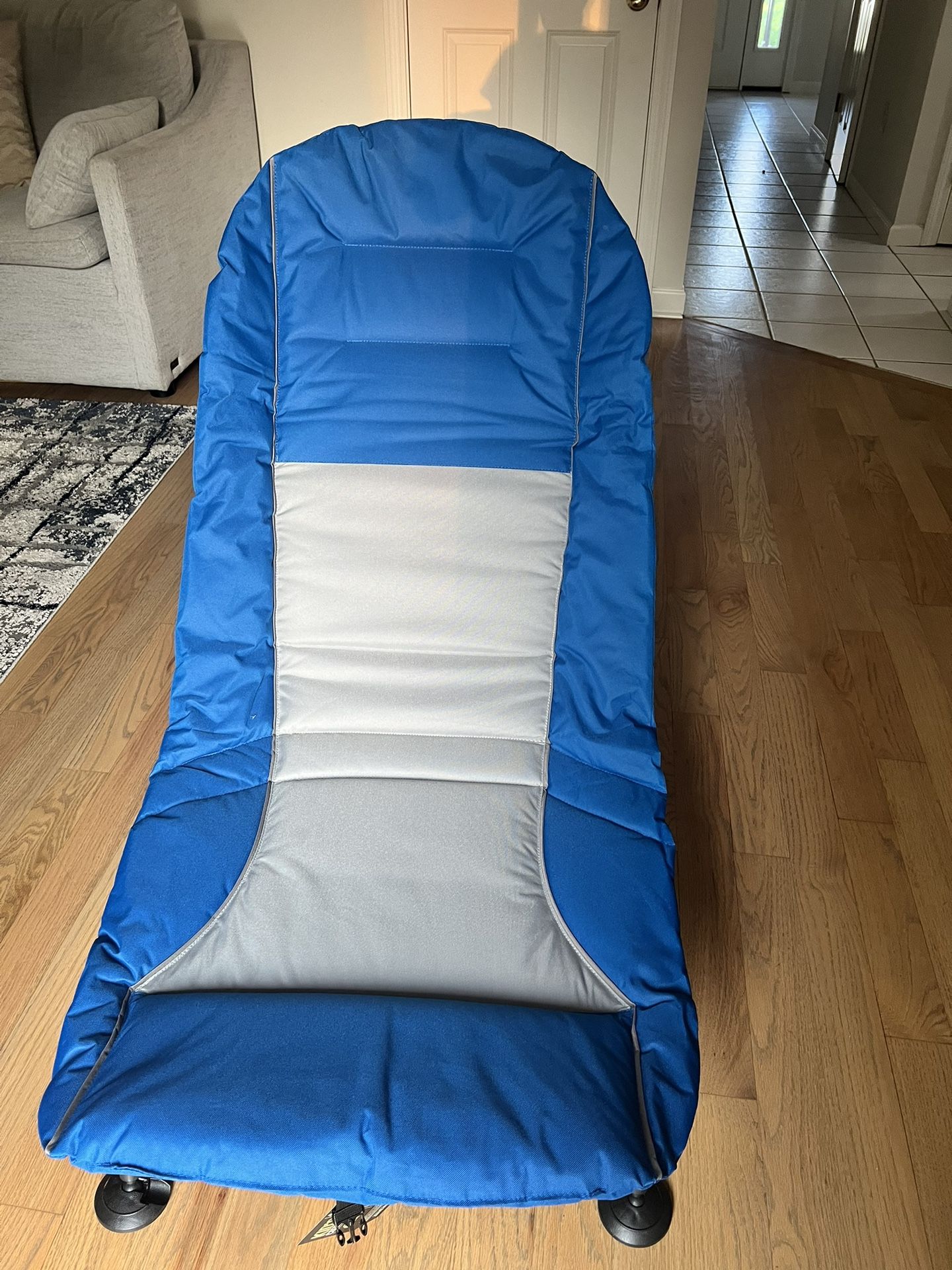 Kids cozy cot with multiple reclining positions. Bungee suspension for greater comfort. With rugged steel frame. 150lb weight capacity