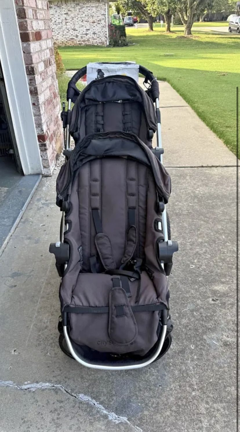 Good condition Baby Jogger City Select stroller with two seats (convertible for one or two children). -Seats can be configured in multiple ways (forward, backward, or facing each other) -Adjustable sun canopies -Reclining seats with harness straps -Large under-seat storage basket -Easy fold for transport and storage -Condition: Used, fully functional. Converts from regular into a jogger. Multiple set ups shown in pictures. -A bit sun bleached on the canopies from being used, but shown in photos -Retails close to $1000.