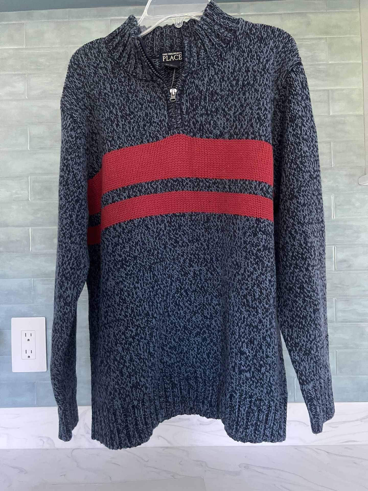New with tags navy and lighter blue heathered quarter-zip boys The Children’s Place sweater with two horizontal red stripes Size XL. It is a knitted pullover sweater with a mock neck and a zipper closure. Acrylic and cotton I ship using recycled materials for the good of environment.