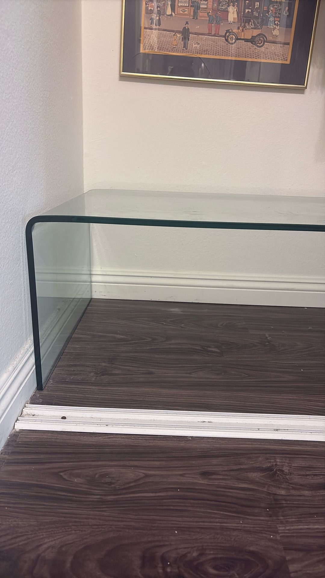 Superb glass coffee table. Ultra minimalist. In great condition. It’s a bit heavy, measurements in pics. Don’t need anymore, kept in pet and smoke free home. Approx 14in high, table top 22x38