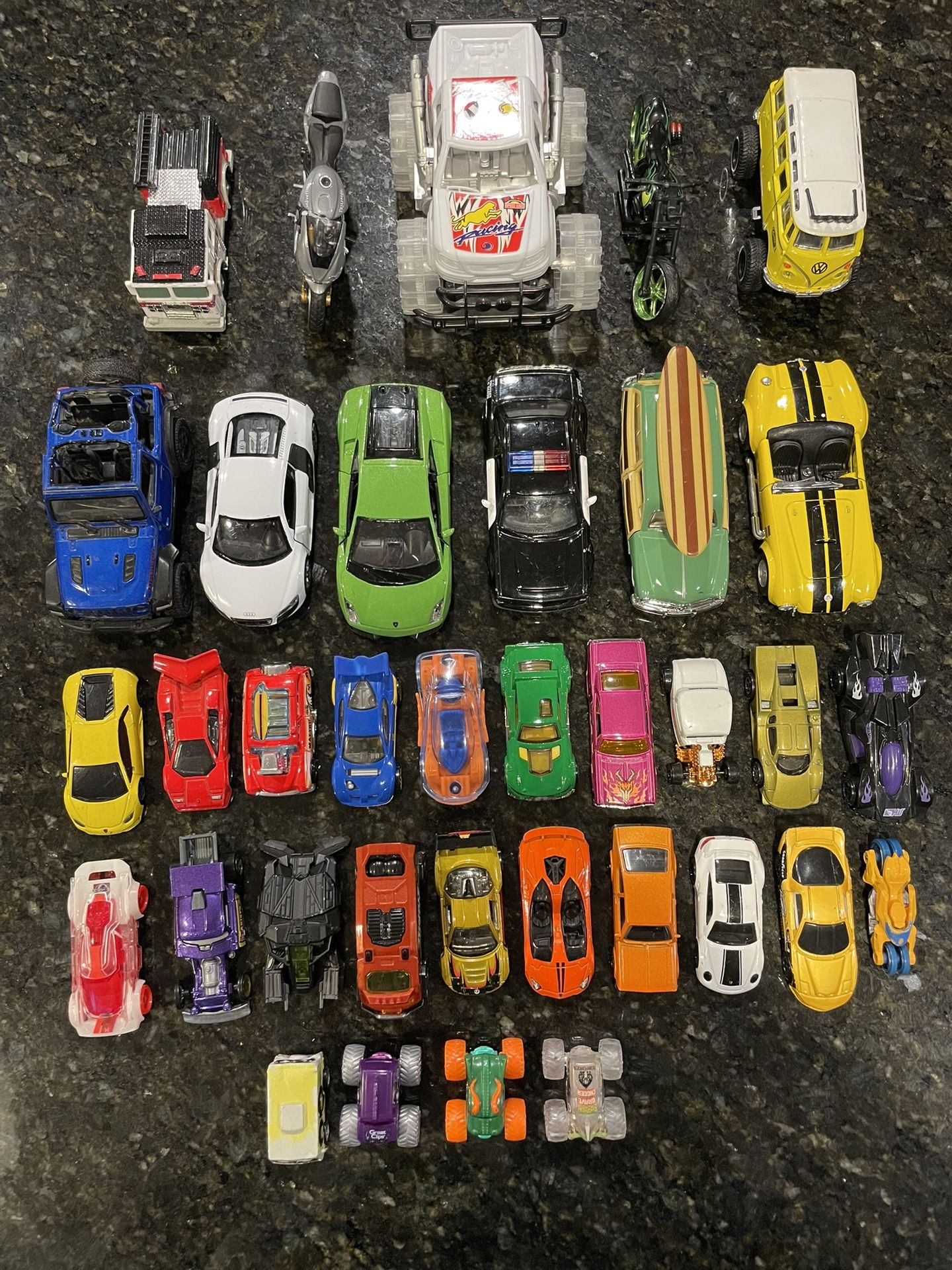 Toy Vehicles Lot of 35 - Hot Wheels Cars, Motorbikes, Jeeps, Monster Trucks