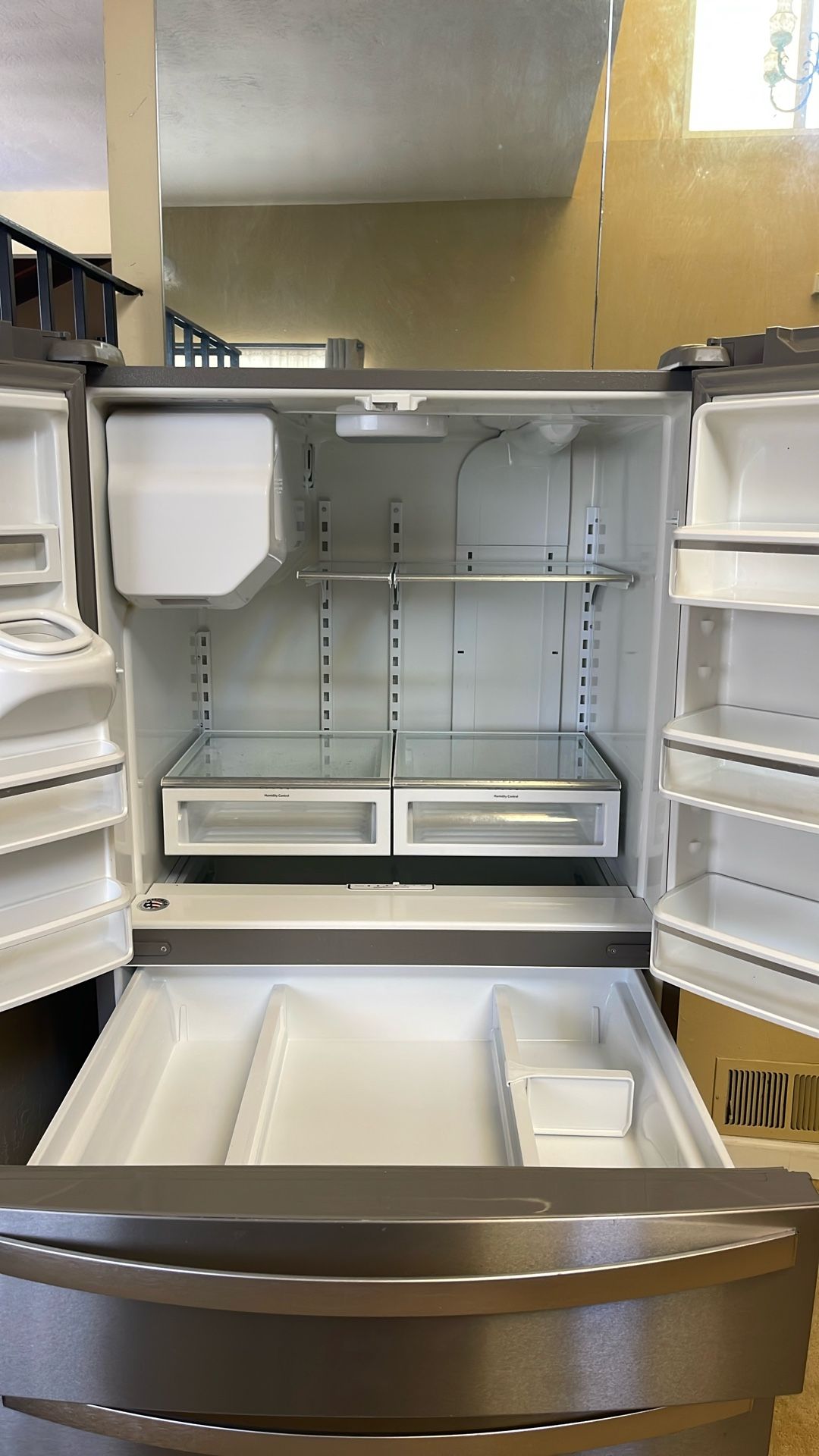 Used Whirlpool refrigerator with French doors and bottom pull out freezer drawer and cooler drawer. Water and ice machine never used. Refrigerator and freezer still work and blow cold air. Very clean and well maintained. Only reason selling is we have a new refrigerator in the house we’re in. (Still Available. I will remove when sold)