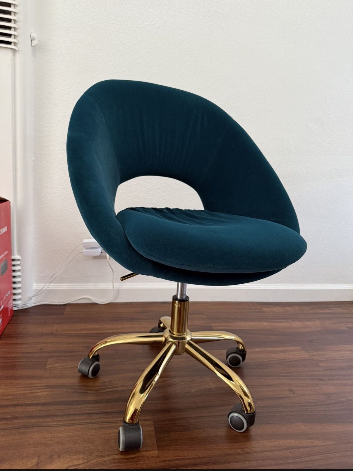 Material Velvet 100% Polyester Product Dimensions 24"D x 24.5"W x 35.5"H Size 24D x 24.5W x 35.5H Inch Back Style Open Back Durable and Comfy Seat: Made with premium velvet fabric, this velvet home office desk chair provides high elasticity for a comfortable seat and is not easily deformed after a long time use. Adjustable Height: The height of this chair can be easily adjusted from 32.55 inches to 35.55 inches, suitable for different heights of people. The glossy gold metal trim on the base adds modern glamour. It’s a perfect gift for teens, girls or women. 360° Swivel and Rolling: Equipped with a 360-degree swivel seat and 5pcs 360-degree swivel wheels, this task chair allows you to move from one work task to another easily. It spins nicely and so lightly to move around, plastic wheels won’t damage your floor when rolling. Multifunctional Use: This cute office chair is very friendly to small spaces, it fits right under your desk when you not using. The low back and wide sides make it great for sitting up straight, or tucking your legs up. Perfect for study, living room, bedroom, office, dorm, guest room, vanity, etc.
