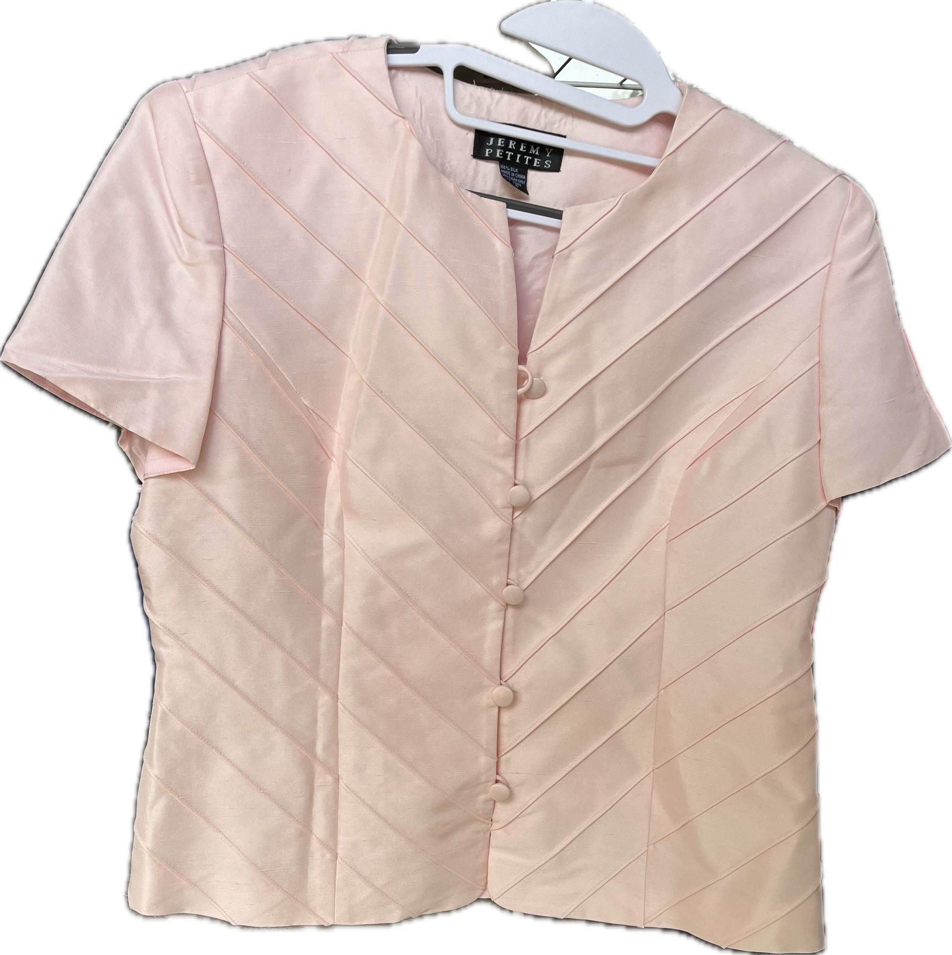 Like New in Perfect Condition! Elegant high quality silk short sleeve top with sharp quilted pieces forming 80’s fem glam inspired structured design. Binded collarless neckline with hooks to keep smooth lines. Silk shank buttons create a sleek feminine look for formal, office, events, nights out. Works with skirts, slacks and shorts in linen, silk, wool or cotton. Pairs with scarf, layered over sweater or blouse. Blank slate, unique design.