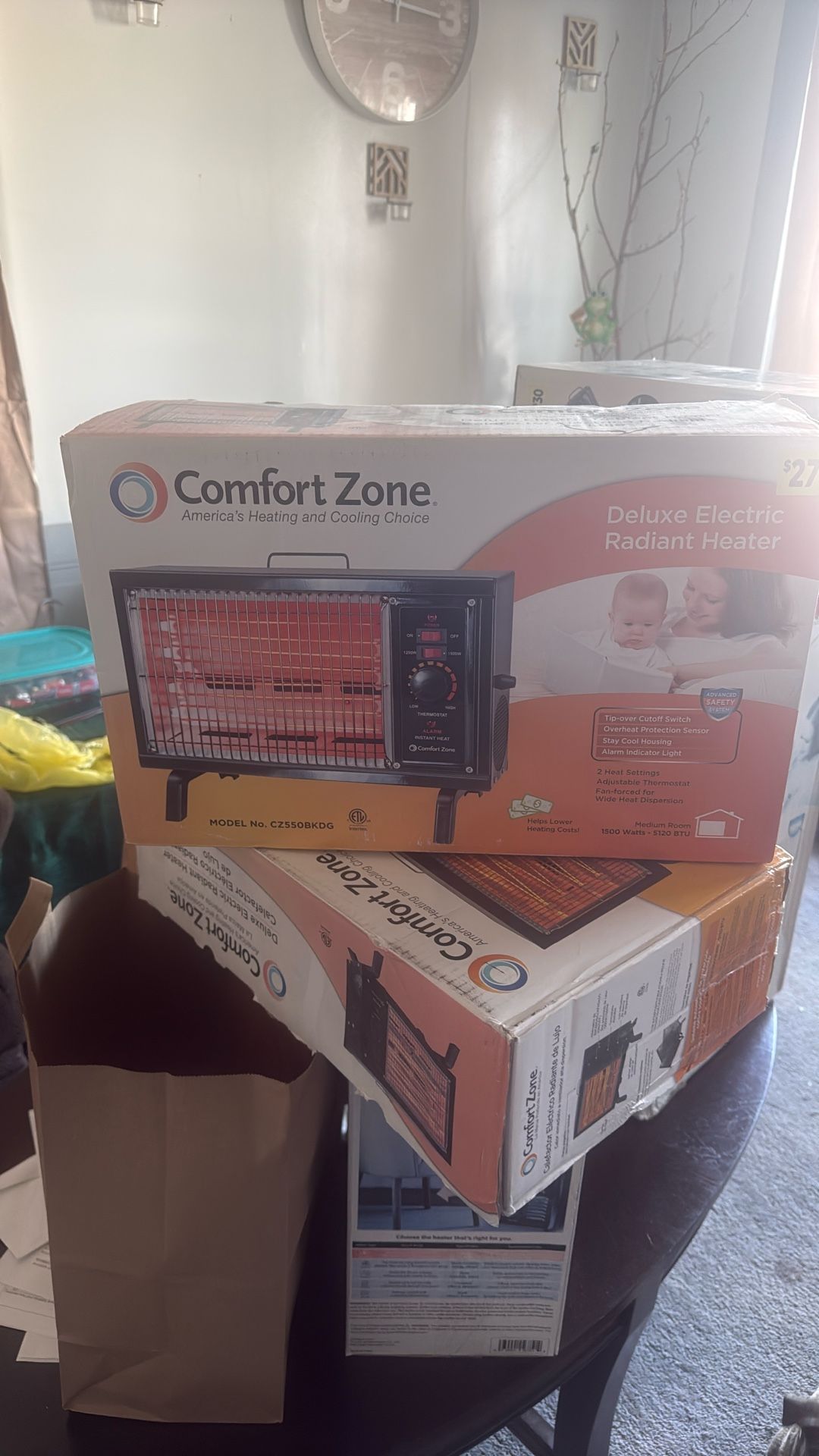 Brand new. In box still. Tip over cut off switch. Alarm indicator light. Adjustable thermostat. 1500 W. 5120 BTU.