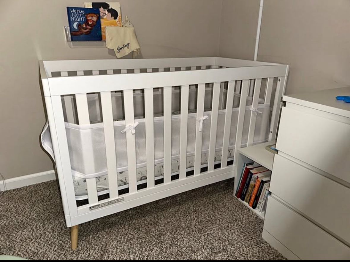 Purchased on September 11, 2025, and gently used with lots of love and care. Everything is clean, well-maintained, and ready for a new baby's sweet dreams 7 Selling only because of a move. Includes: • Delta Children Essex 4-in-1 Convertible Crib - Bianca White with Natural Legs (modern and sturdy design). Delta Children Twinkle Stars Mattress - breathable, GREENGUARD Gold Certified, waterproof, with a removable washable cover. Breathable mesh rail protector to keep baby's arms and legs safe. Two KeaBabies organic cotton waterproof sheets (52x28) - soft and cozy. All items are spotless and in great condition. Neutral color fits any nursery decor. Standard size. Pickup: Naperville, IL