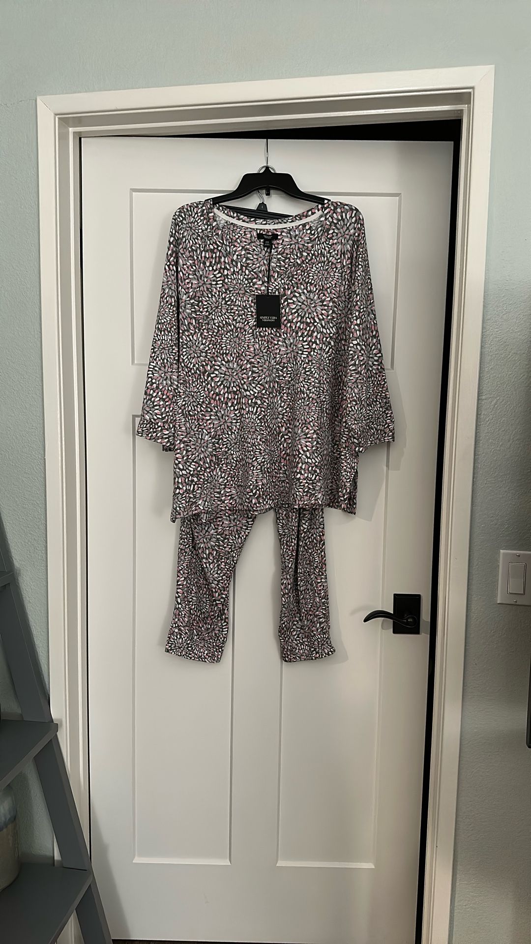 This is a beautiful abstract pattern, matching two piece pajama set Very soft has matching cuffs around sleeves and pant bottoms Top of pajama has slits on both sides for extra movement and comfort Located in Rancho Bernardo / 4s area Cash only no cash apps