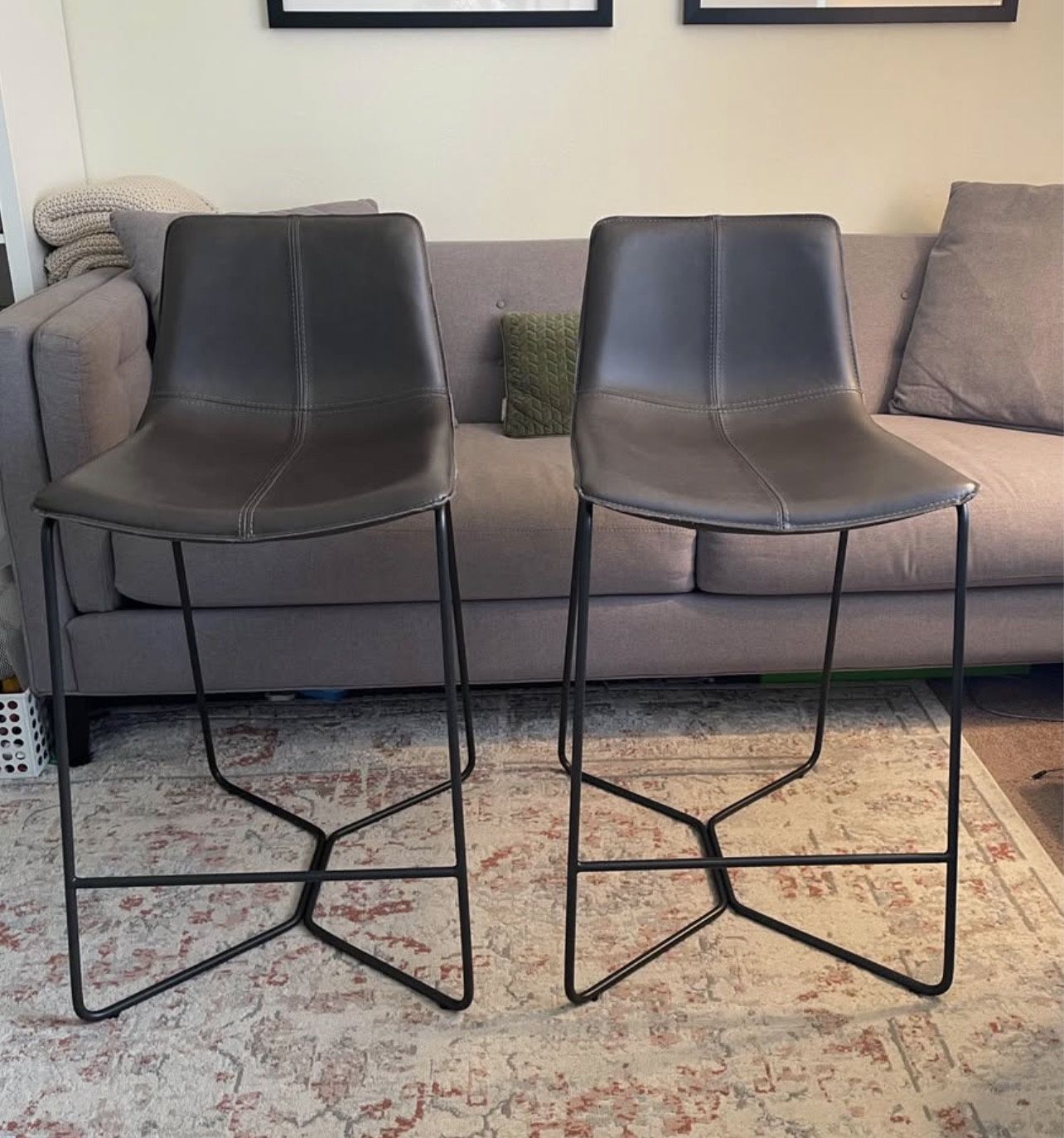 2 West Elm Slope Leather Counter Stools In excellent used condition Comfortable, stylish and sturdy. Overall Dimensions: * 19"w x 21.7"d x 36"h * Seat height: 26" * Back height: 16" * Seat depth: 18" * Weight capacity: 275 lbs. Counter Stool - 26" Height Original Price: $449/each plus tax Asking $400 for both