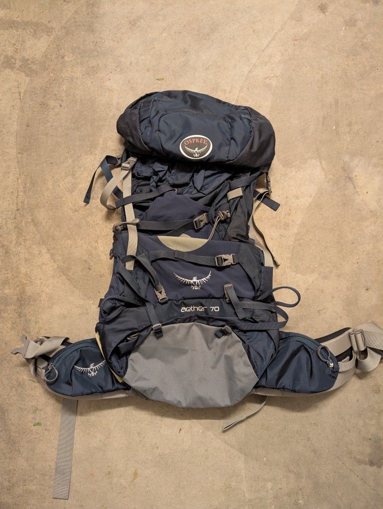 2016 Osprey Aether 70 Backpack. New condition. Never used. Features 70 L capacity Removable top compartment Frame can be removed and be replaced Walking pole attachment Access to the bag from the bottom and top AirScape backpanel with foam ridges for ventilation, sternum strap with emergency whistle Stretch mesh side pockets with InsideOut compression, top lid access Twin zippered hip belt pockets, twin ice axe loops Pre-curved IsoForm CM moldable hipbelt, removable top lid, converts into lumbar pack Integrated & detachable raincover, weight : 2.29 (M) kg, maximum dimensions : (cm) 90 (l) x 36 (w) x 35 (d) Dimensions: 33" x 17" x 15" Empty Weight: 2.39 Kilograms Volume: 4272 cubic inches (70L) Torso Fit Range: 18-20.5" (46-52 cm) Hip Belt Fit Range: 30-34" (76-86.5 cm