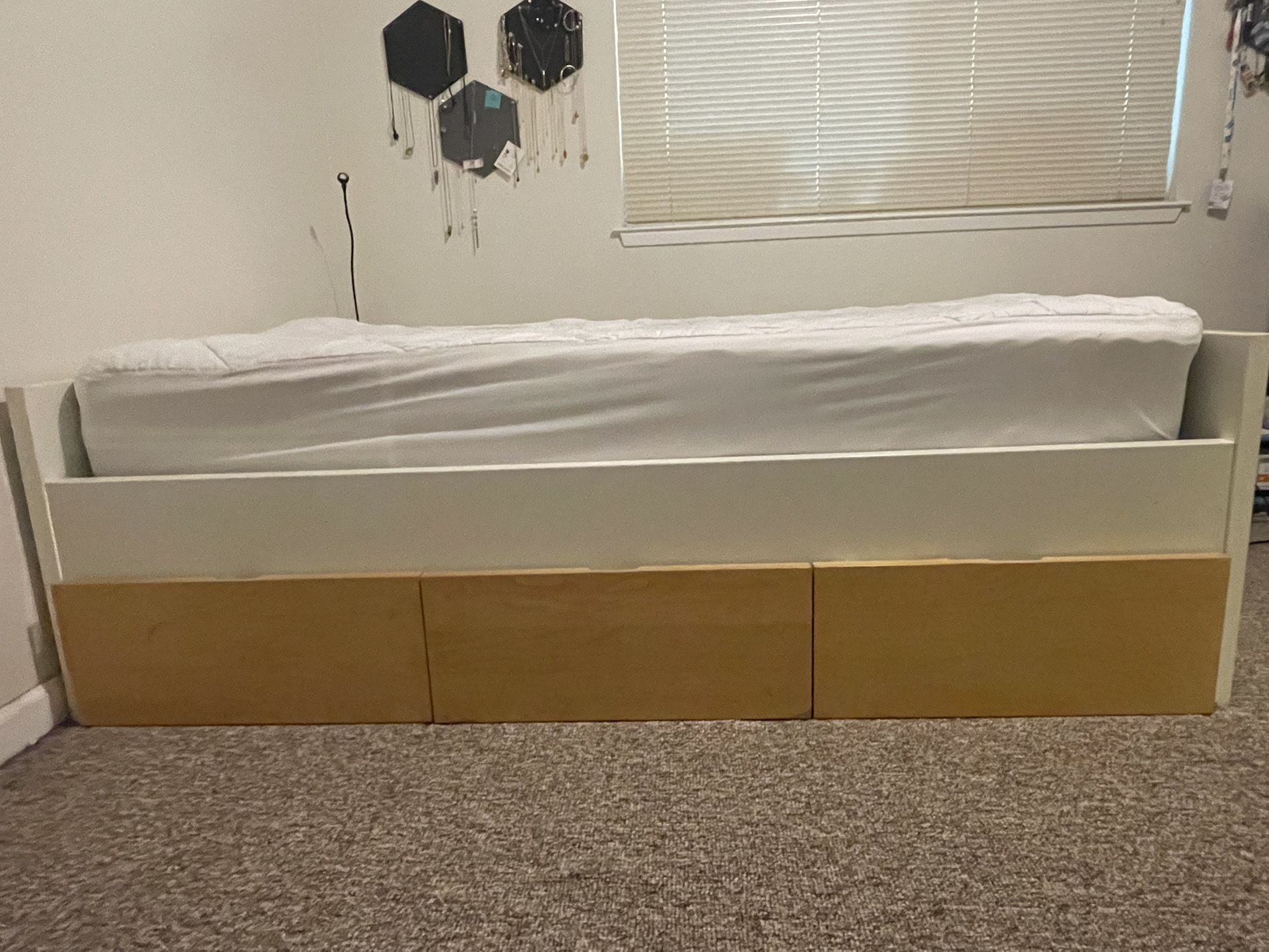 IKEA - Brekke Twin Bed with storage drawers - White/Brown Edition - I am moving, so I need to sell all my IKEA furniture. - 2nd owner of this bed. - Previous were parents of kids. - Very left drawer in photo has dent from their kids - Didn’t bother me, so I bought it obviously - Twin mattress is still pretty new and included. 3 years old. Has foam cushion underneath fitted sheet. - The storage space underneath can fit a lot. - For reference, I could fit my jeans, T-Shirts, work out pants, and tops. - Feel free to message me for questions/concerns. - Serious buyers please - I can’t deliver this item. Pick-up item. :(