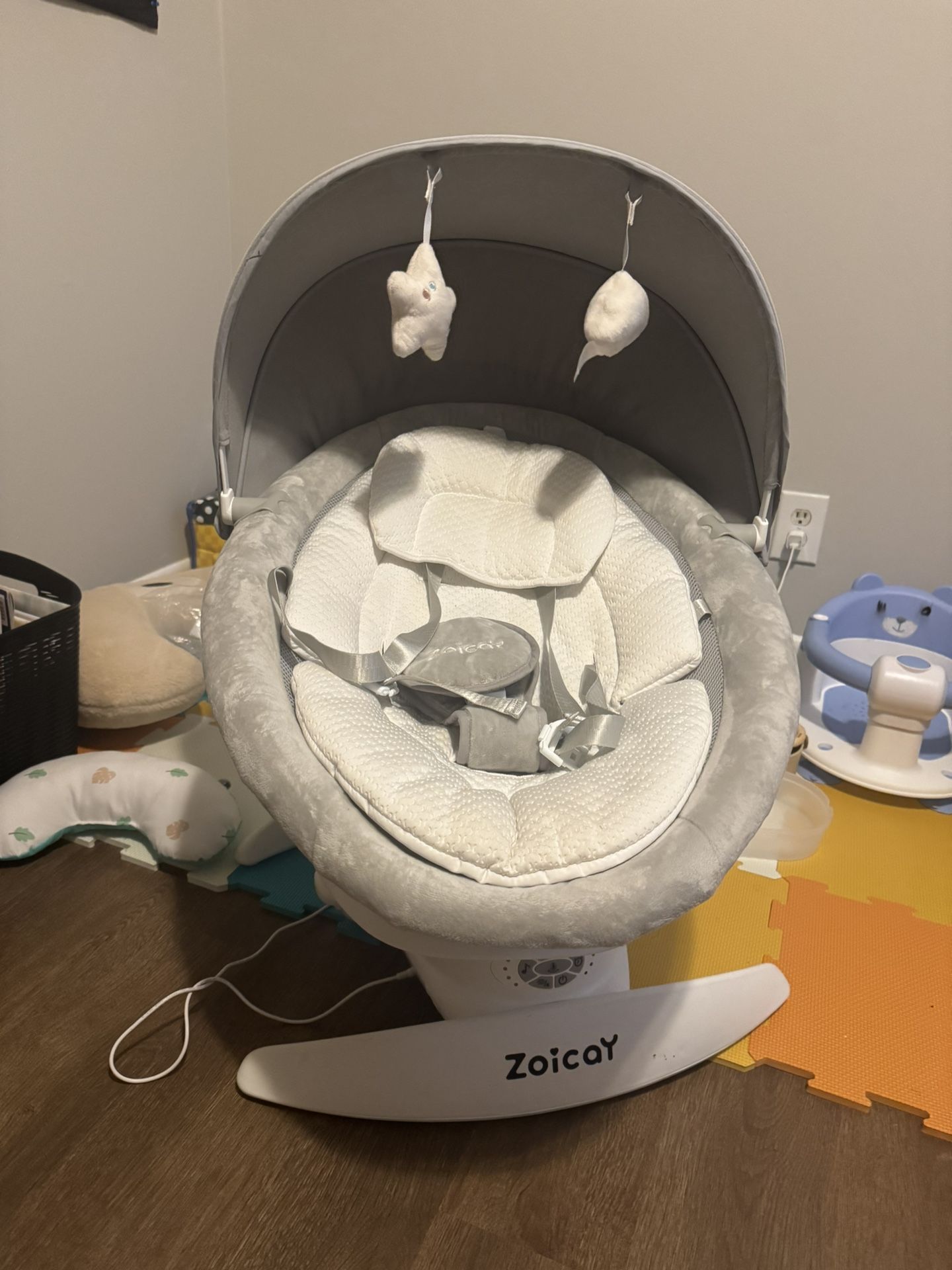 This swing has been used only 3-5 times and works perfect with no tears or stains on fabric! It comes with a detachable canopy with a mosquito net, wireless remote to control when batteries have been out in swing, and the plug for the wall if you donβt want to use batteries. This swing is Bluetooth to your phone as well.