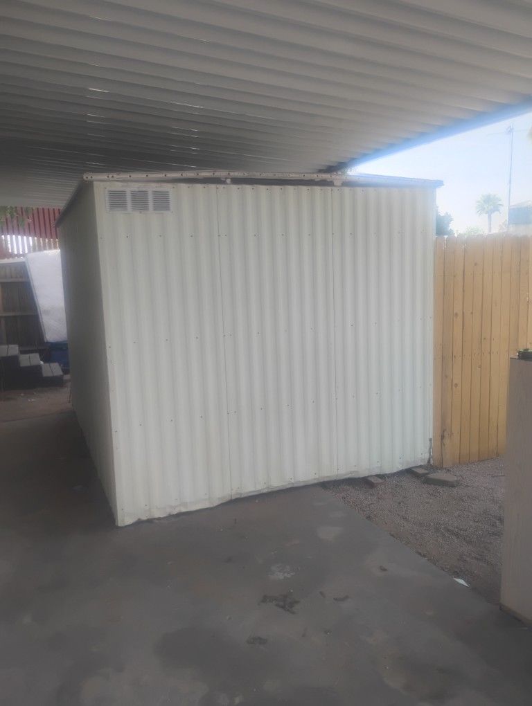 8x12 storage shed with outlets to plug in from an extension cord. Has switched for lights. I've had it for 3 years moving no longer need. I put Styrofoam on walls and ceiling which kept it cool during the summer. Also has one window and two doors.