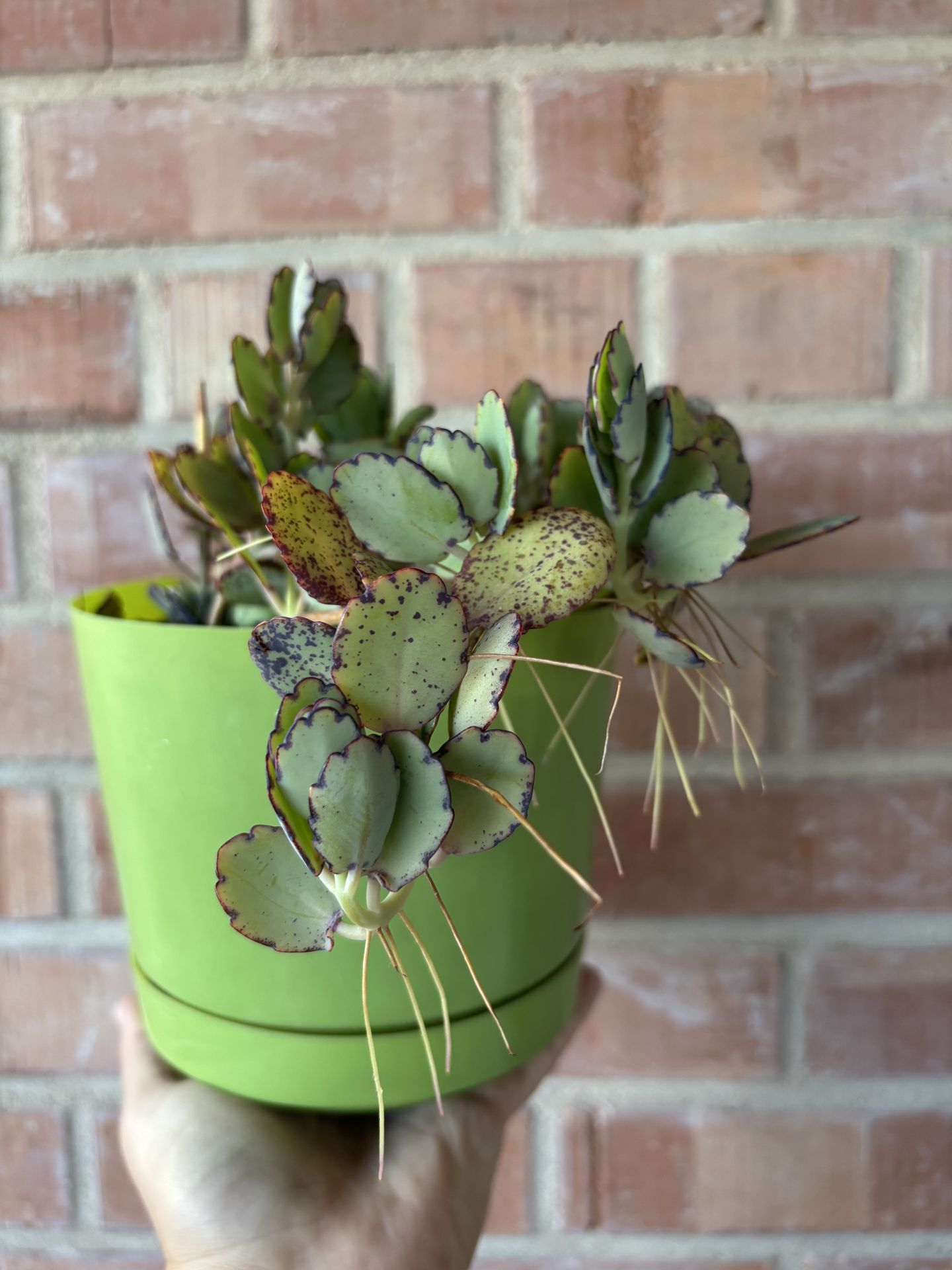 Healthy trailing kalanchoe succulent in a bright green pot with attached drainage tray—lots of aerial roots! Established and ready to go. Pickup: CVS, 5100 E Grant Rd 85712 💲10 — priced as listed Tags: kalanchoe plant, kalanchoe succulent, trailing succulent, kalanchoe houseplant, easy care succulent, drought tolerant plant, succulent arrangement, indoor succulent, desert plant, plant decor, Tucson plants