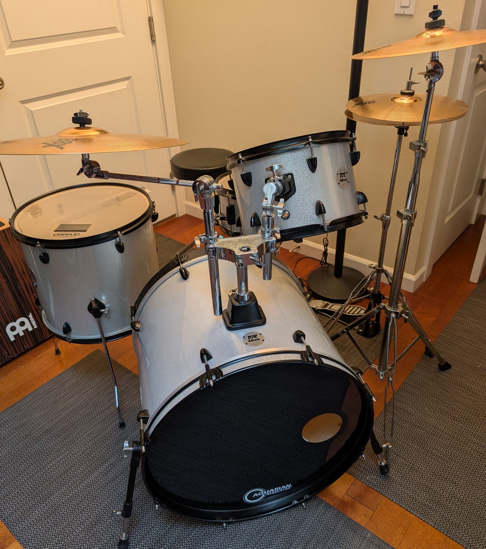Complete cymbals and hardware included. 5x14 snare 8x12 Tom 14x16 Tom 18x22 Bass Sabian B8X CYMBALS 14" hats 14" crash 18" crash/ ride Hi hat stand Snare stand Cymbal stand Cymbal Arm Seat Bass pedal