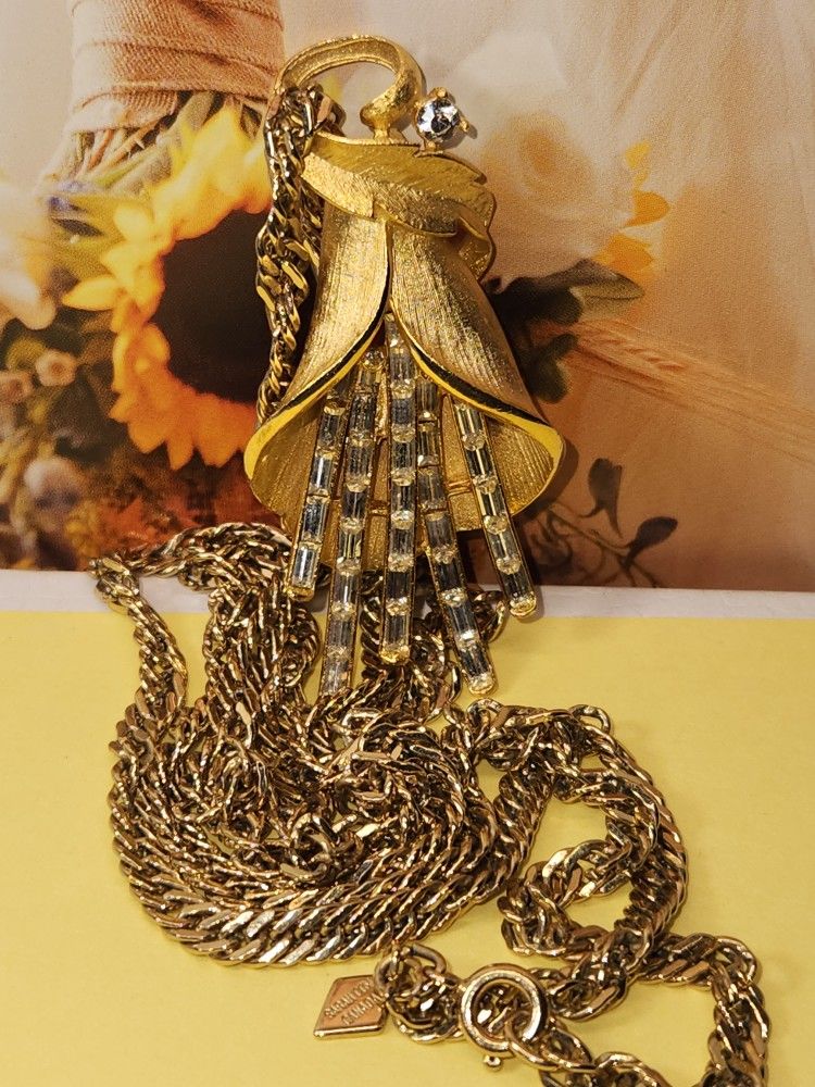 #2132, SIGNED SARAH COV CANADA, GORGEOUS TWISTED ROPE 30"INCHES IN LENGTH & PRECIOUS PENDANT 2.5"INCHES IN LENGTH, BAGUETTE CUBIC ZIRCONIA STONES, THIS ITEM IS IN EXCELLENT CONDITION.