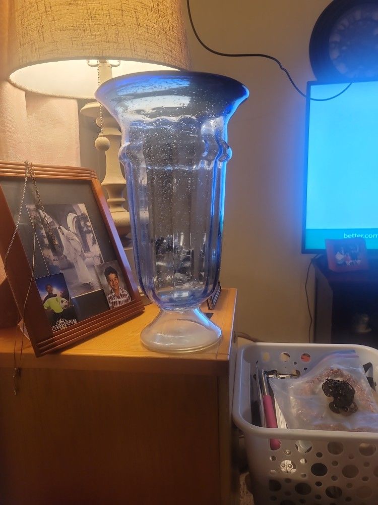 Heavy quality vase with a saffire edge. No cracks or chips. 15 inches height diameter 8.7 Design period 60's Beautiful I seen this same vase with 2 other sellers. They averaged out too 320.00 each.