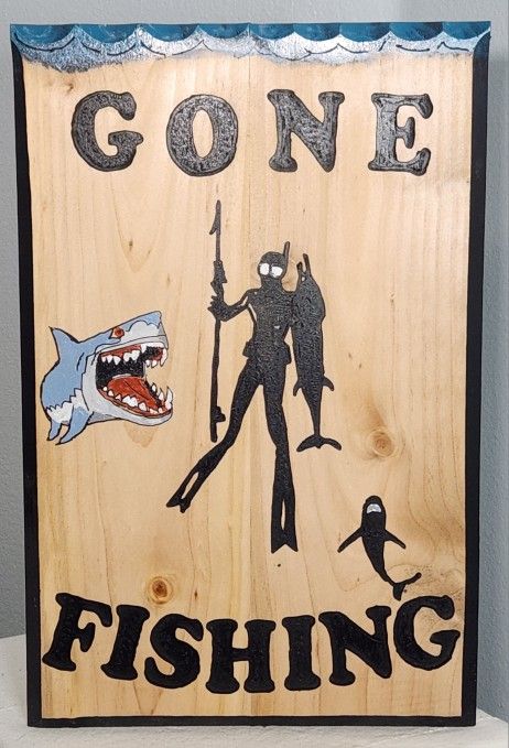 Transform your space with our freehand carved Gone Fishing sign. This piece features a skilled diver with spear in hand, showcasing their prized catch. But beware! Two menacing sharks lurk nearby, their sharp teeth and silhouette add extra thrill to the scene. Recently finished and ready to ship. Thank you for supporting your local craftsmen and craftswomen.