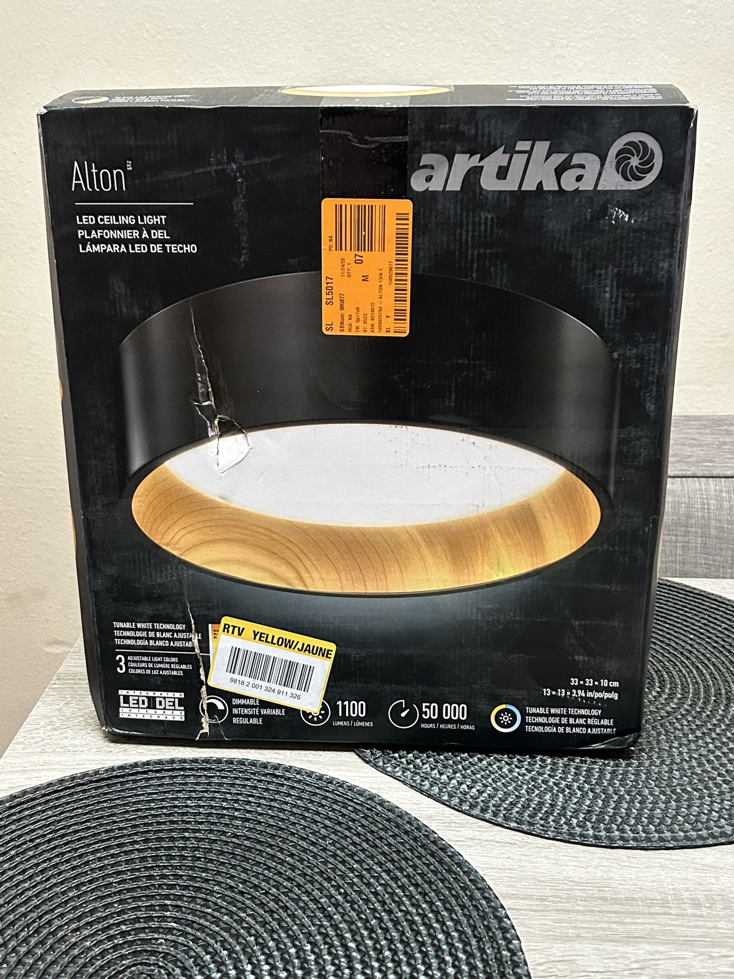Brand New artika Alton Flushmount Ceiling Light Fixture, CCT, Black and Wood Accent
