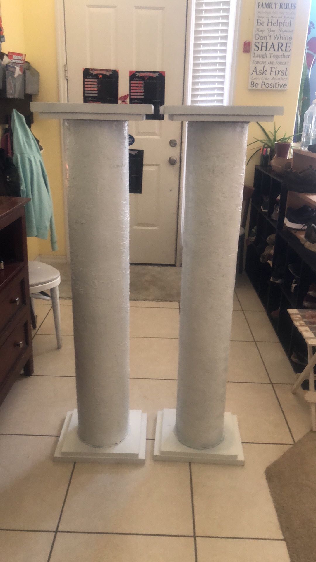 Two beautiful handmade wedding columns. Very sturdy well made columns that will hold up well for your big day. The top comes off so you can put a sand bag inside to help weight it down witch is especially helpful for a beach wedding. The top is level so whatever you decorate it with will be safe and stay in place.