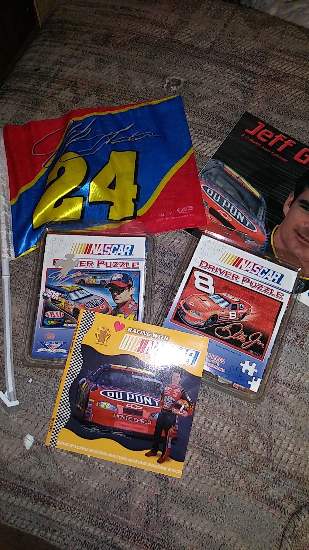Gordon puzzle $25, Dale jr puzzle $9, kids book $7, calander $7, door flag $10
