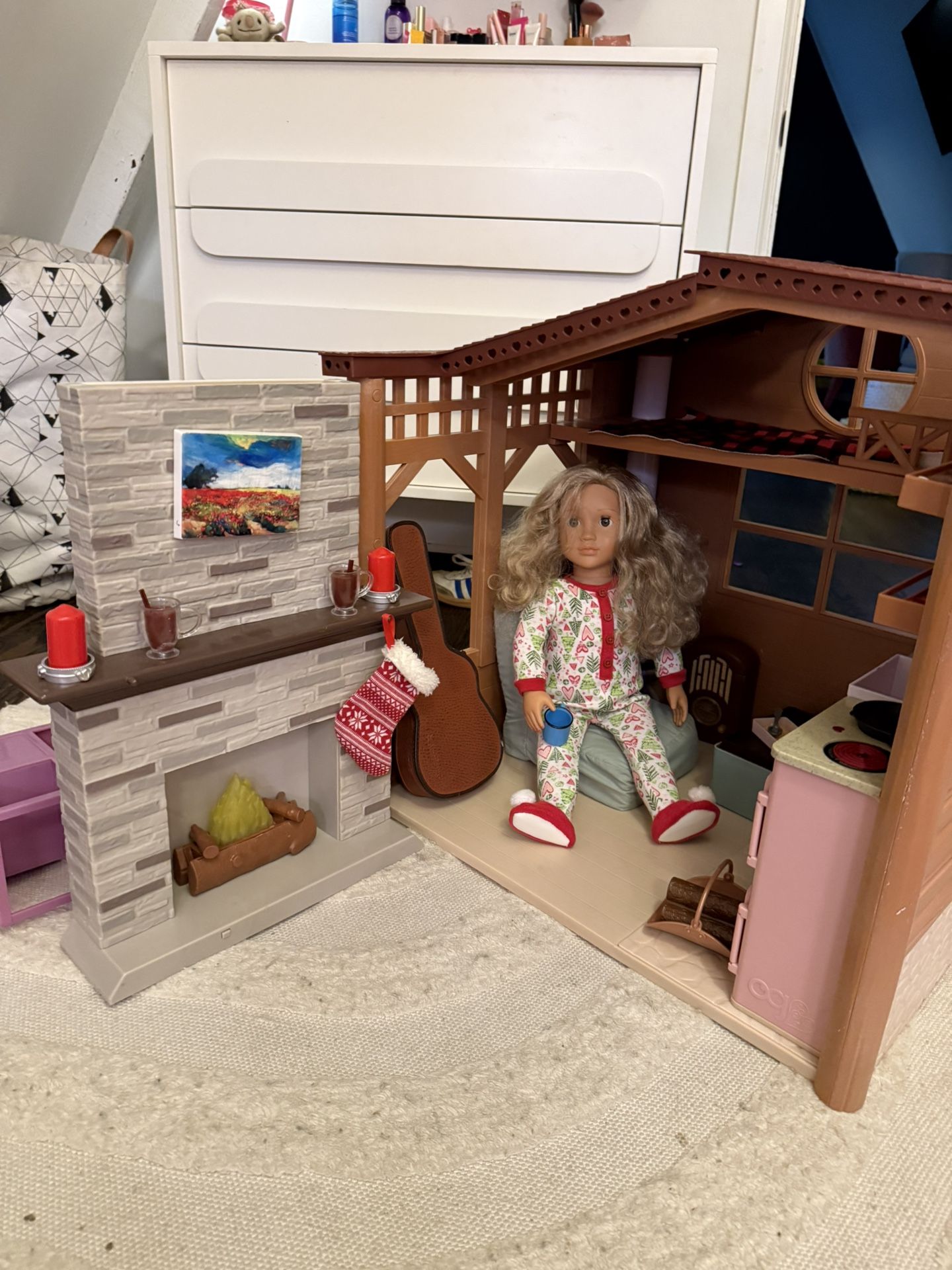 The cozy cabin by our generation comes with doll and Christmas pajamas too! The ultimate Christmas gift! Sold as a set includes all accessories pictured and the doll with two outfits