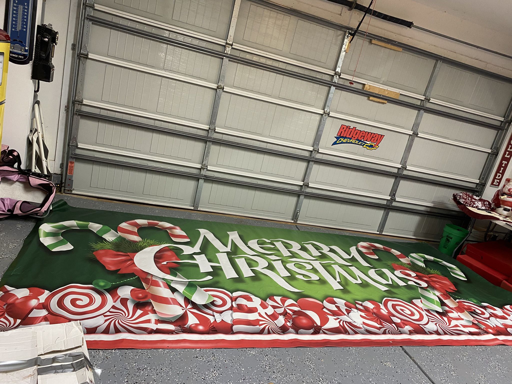 Used garage door mural.Can also be used to hang on fence Or in yard.Made out of heavy duty vinyl ,and is 7 feet tall and 15.6 inches wide.Has spring loaded brackets and instructions to mount on garage door.Pick up in New Market on Butler Road near Phillips Road