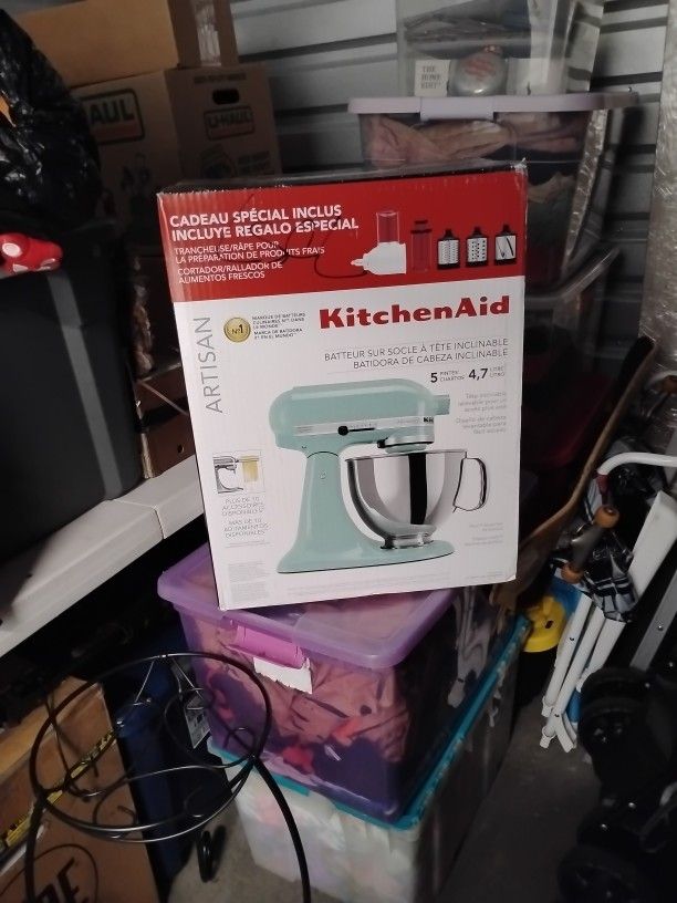 Brand new still in the box UNOPENED. Please look at the pictures for details on the kitchen aid. It's been in my storage and I still haven't used it. My loss, your gain.