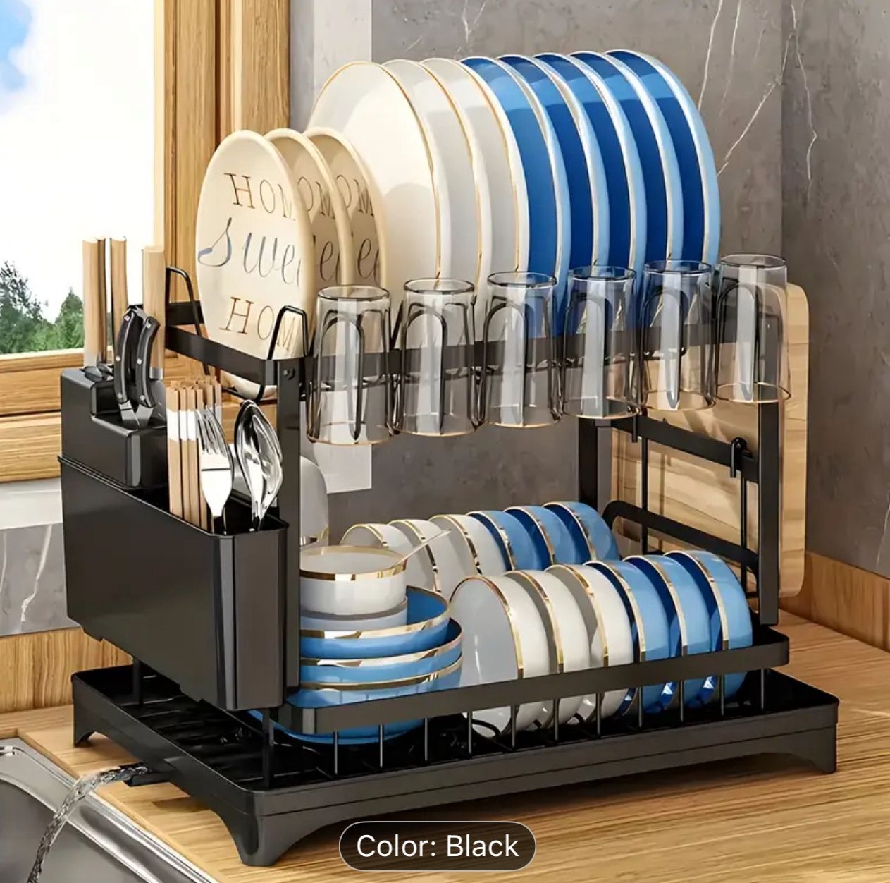 1pc Large 2-Tier Heavy-Duty Carbon Steel Cutlery Organizer with Drain Board & Utensil Holder - Rust-Resistant Kitchen Countertop Dish Drying Rack, Space-Saving Black/White Design, 11.81”H x 16.54”L for Plates, Bowls, Cups Storage