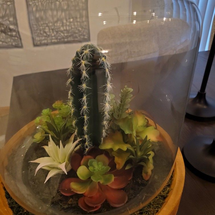 Terrarium measures 17H x 12 in. in diameter Crafted of glass, wood, and artificial material Features an artificial succulent mix Arrangement sits in a clear glass container Hues of green and brown. In great condition Pickup palos hills price firm.