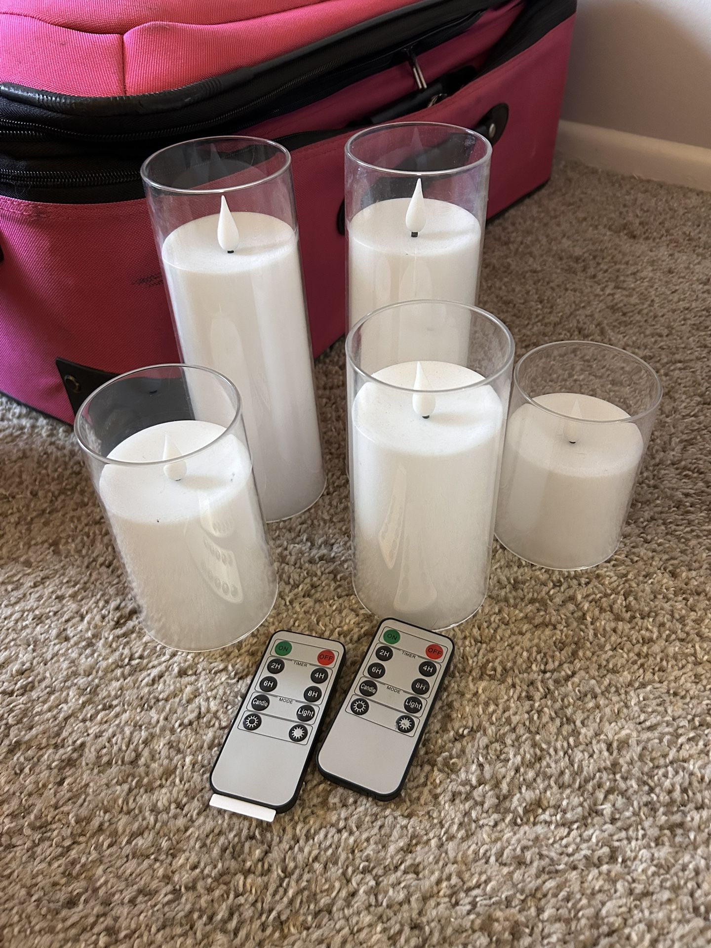 Set of 5 electric candles with remote operated. Candles are battery operated 2 AA each. Can adjust the brightness on them and have them flicker or not.