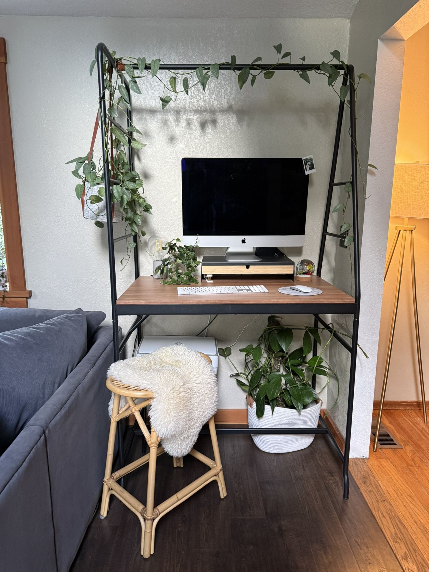 I used this bar height island/table as a desk with a climbing plant going on it. It’s been a great little desk the last couple years, but since I am no longer working from home, I am not using it at all. It’s sturdy and in great shape! Zero complaints. 41” wide x 24” deep x 75.5” tall Asking price is for the desk/table only *the last two photos were stock photos from IKEA, I am showing how it was intended to be used