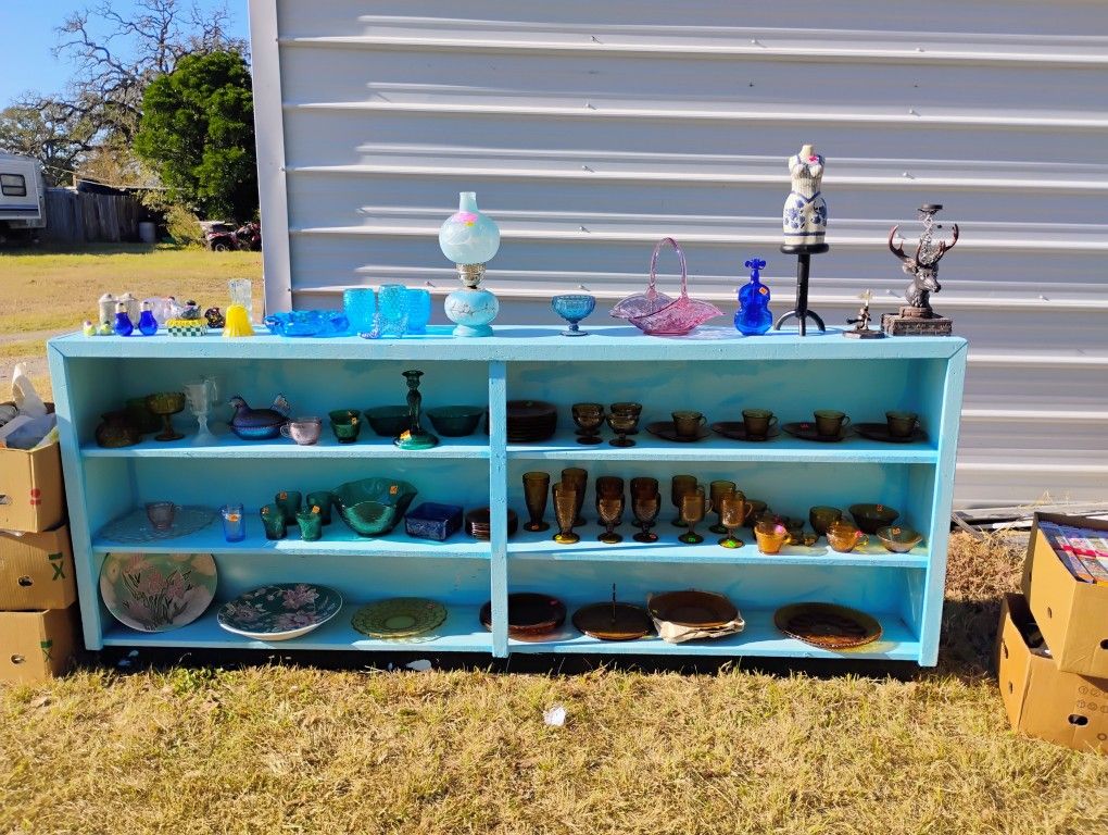 This is a nice big roughly painted blue shelf. In decent useable condition.