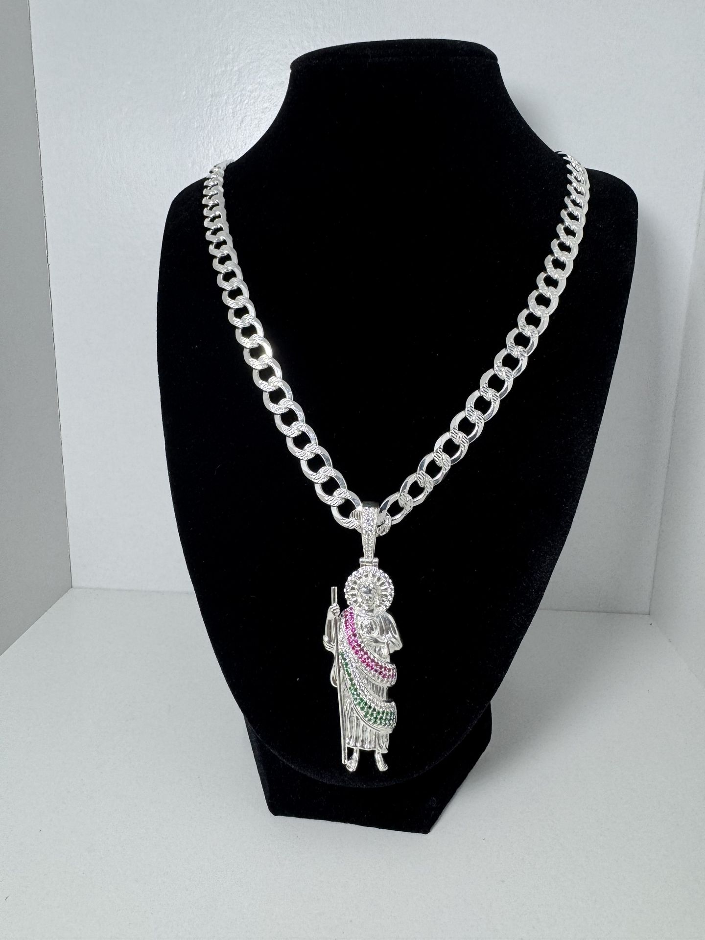 Cadena estilo cubana con dije de San Judas Tadeo con piedritas verdes y rosada plata 925