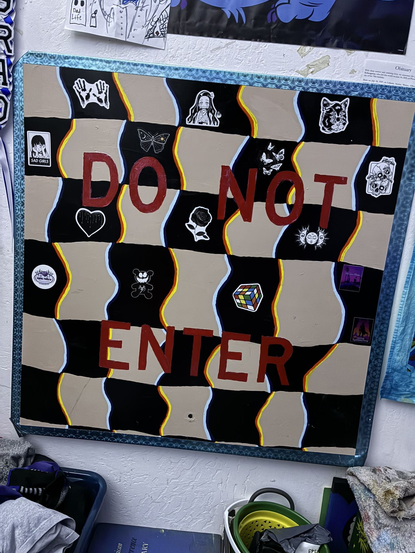 30x30, Customized old Do Not Enter traffic sign with added sickers. It has 2 holes (top and bottom) on the sign to add a nail to display on the wall. (Picks up only)