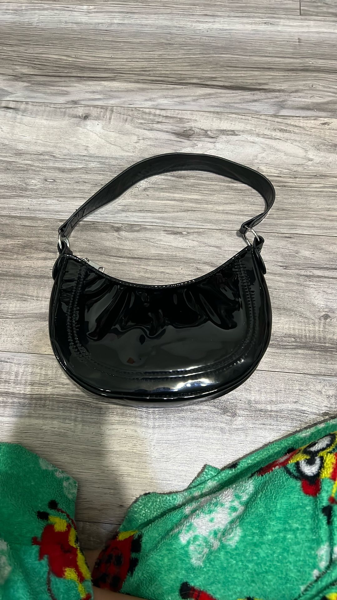 It’s black and glossy, just have too many purses and don’t need this !