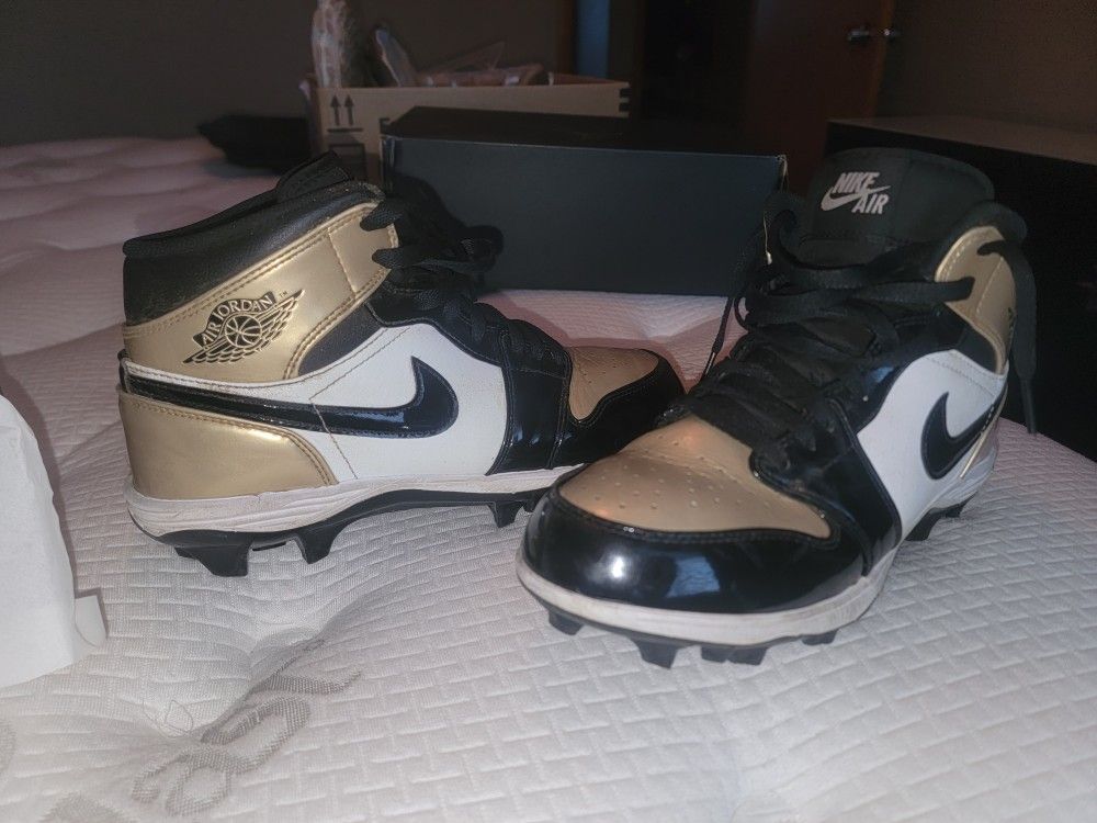 These cleats have been worn for 1 football season Jordan 1 Mid TD Football Cleats - Black/Gold/White (Size 8.5)