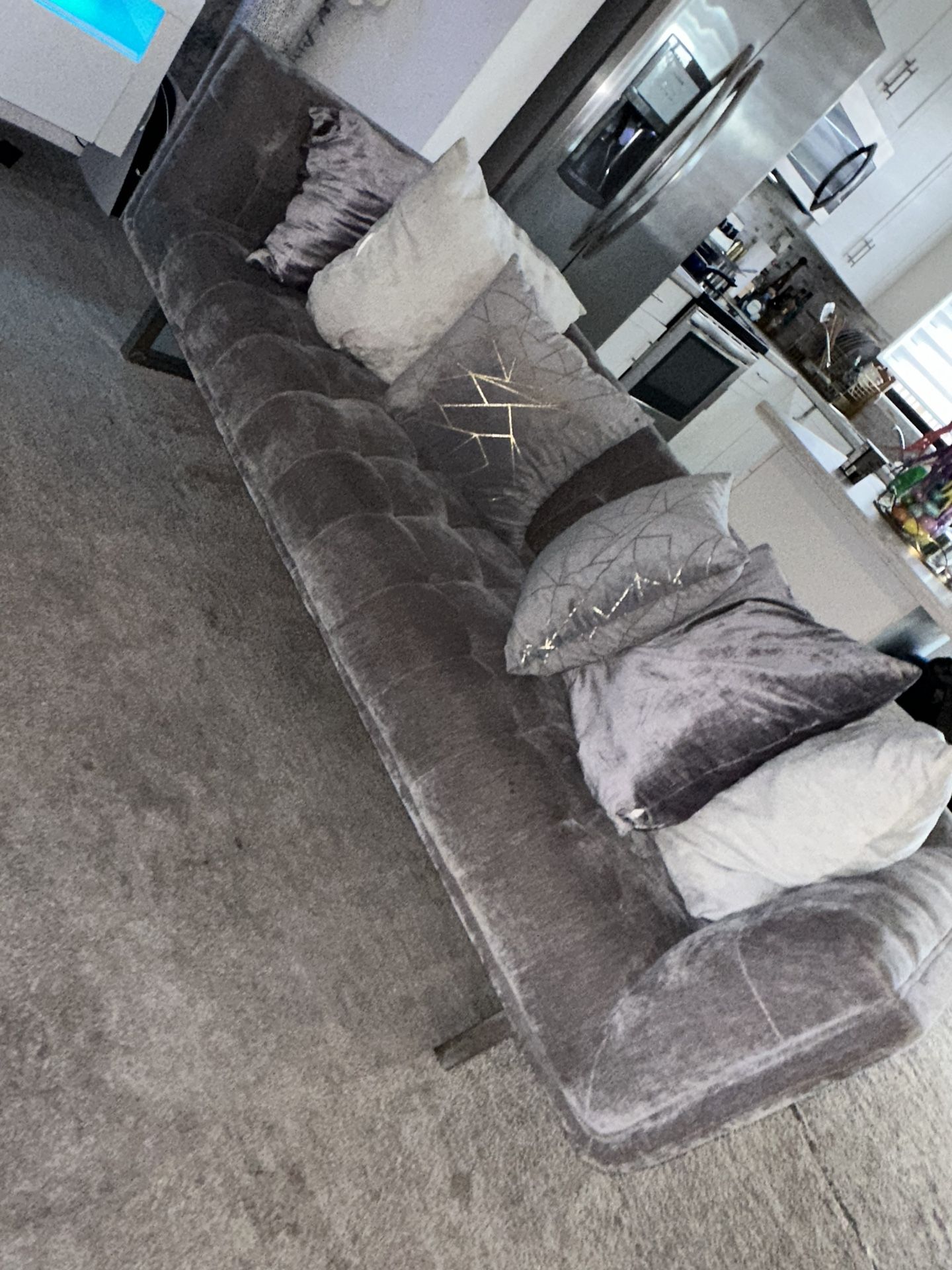 Grey sofa and chair from rooms to go sofa in excellent condition chair has a rip underneath