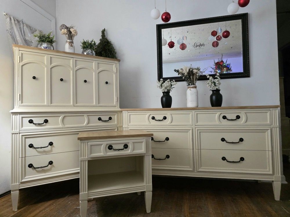 DISCOUNT WHEN PURCHASING WHOLE SET National Mount Airy Furniture Co. known for high quality furniture. Solid Wood, Dovetail drawers, painted a custom off white/light beige, rustic brown tops. All Sales Final Cross Posted West Haven. Please be aware of measurements. $425 Wide 6 DrawersH32 3/8 W56 1/8 D19 $425 Tall 4 Drawers, Top Cabinet H53 3/4 W39 5/8 D19 7/8 $140 Nightstand H24 1/8 W22 D15