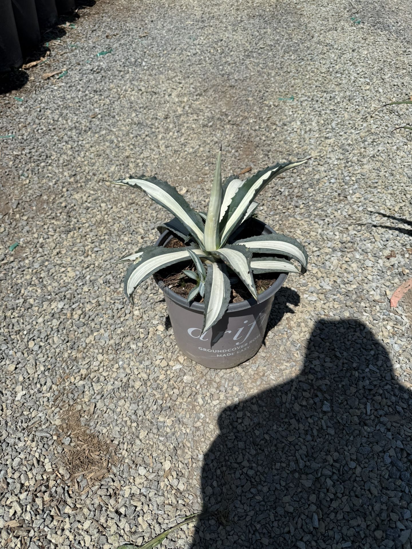 🛻 We Deliver & Install – Minimums & fees vary by distance. ☀️ Light: Full sun 💧 Water: Low – drought-tolerant 🌿 Type: Variegated evergreen succulent 📏 Size: 3–5 ft tall × 4–6 ft wide 🌡️ Hardiness: USDA Zones 8–11 🎨 Foliage: Gray-green leaves with bold creamy-white central stripe and spines 🪴 Uses: Focal points, desert gardens, containers, rockscapes