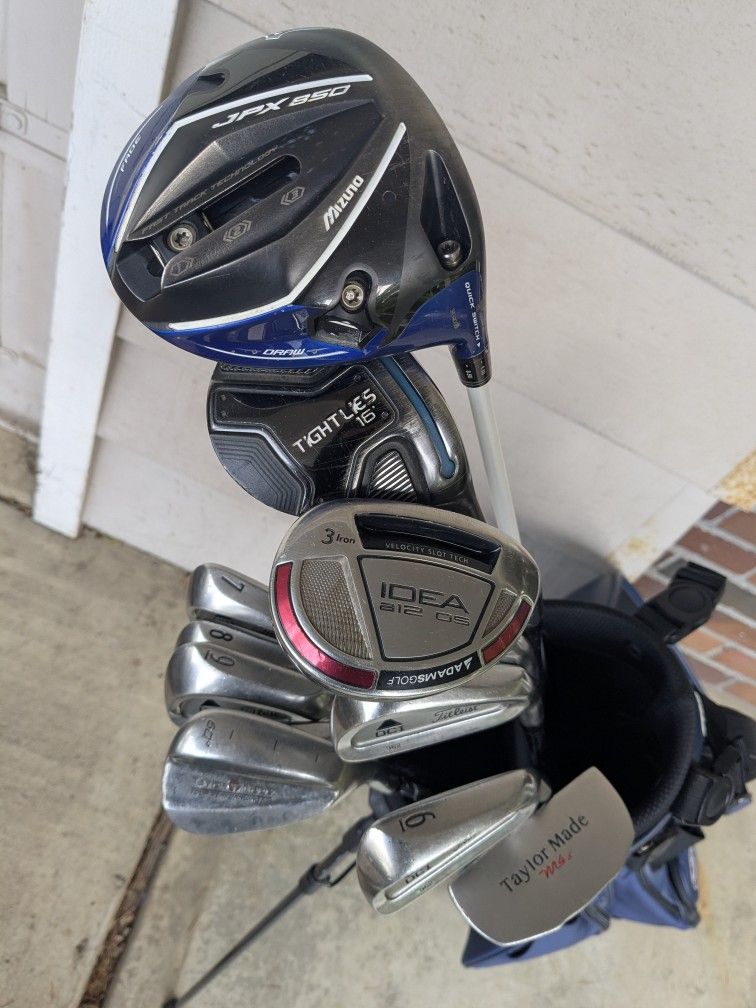 Complete Set Of Men's Right Handed Golf Clubs Mizuno Driver Adams Fairway Wood Adams Hybrid Titleist Irons TaylorMade Sand Wedge TaylorMade Putter Asher Golf x Vessel Single Strap Stand Bag Set in good shape Nice name brand upgrade or for the beginner $300 OBO Cash Only Pickup In Tigard Thanks