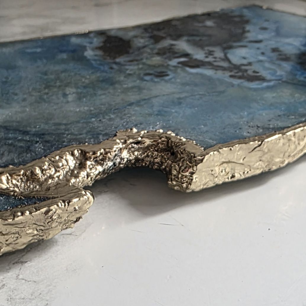 Part of the AnthroHome Gilded Agate collection. Food safe and stays cold, making it a perfect serving dish for cheese or charcuterie. Dimensions: 11 inches x 7 inches. Like New - No Damage. Used only as decor.
