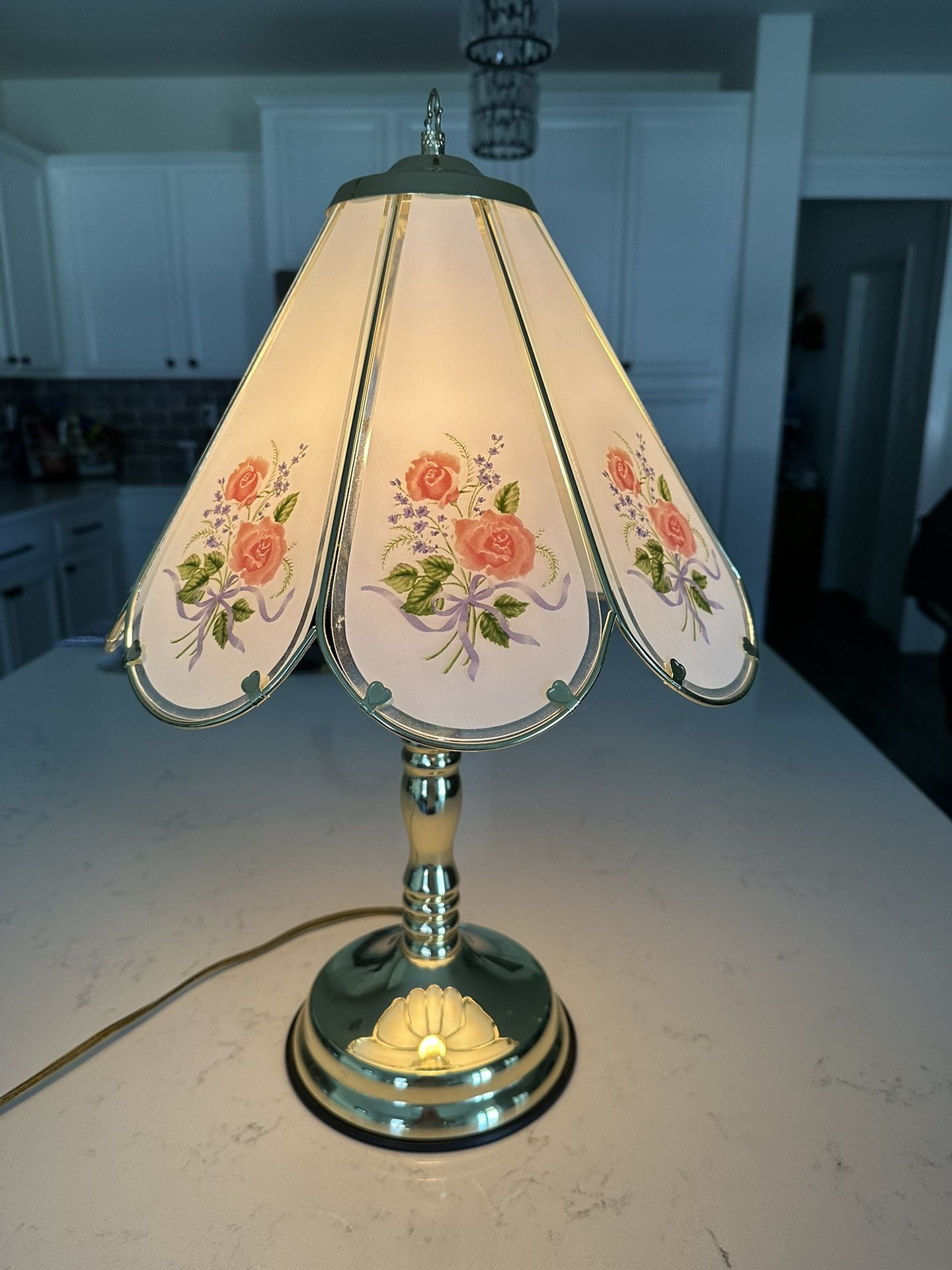 Brass and glass lamp with painted flowers on it. It’s a touch lamp with 3 settings. 22” tall excellent t condition special bulb included. I prefer pick up only. I live in the NW area Renfro & Hageman I accept Zelle or Cash