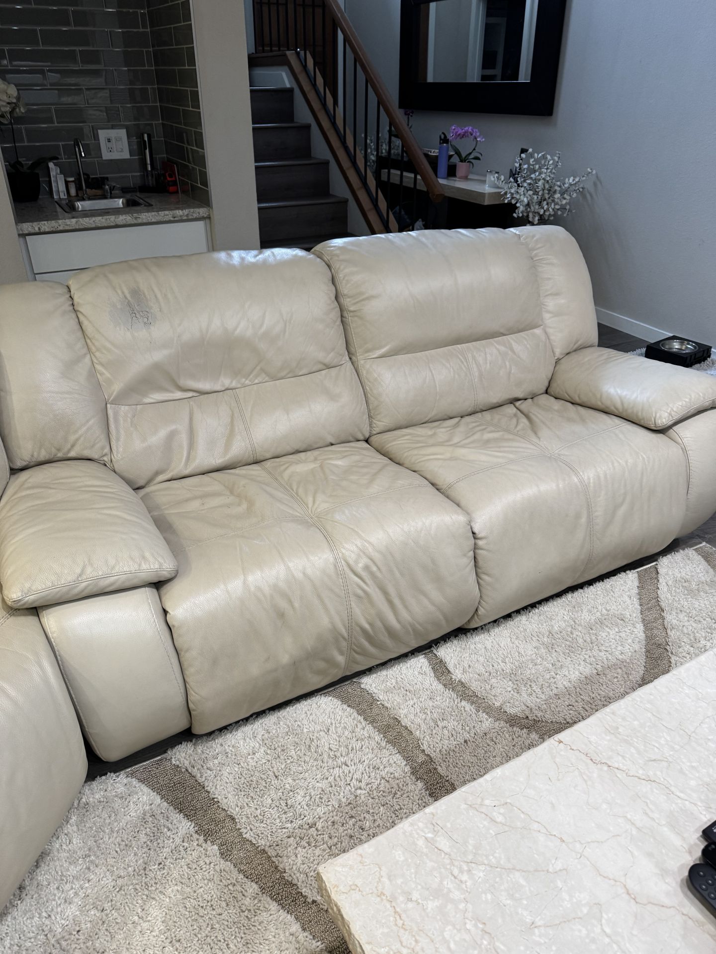 For sale is a leather sectional with reclining seats. 1 seat has a bad switch the other 3 work fine. Has a wear spot. See picture.