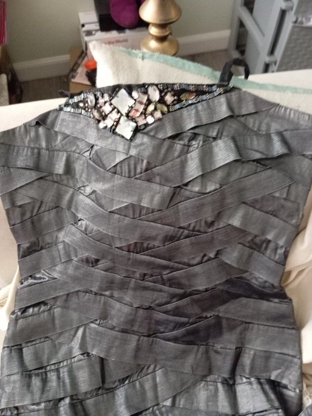 It's stretch wool it's nice long but not to long,it comes with a small jacket and it's gray with little stones in top anyway it's Ready for you to wear it's Clean just worn ones it's Negotiable.