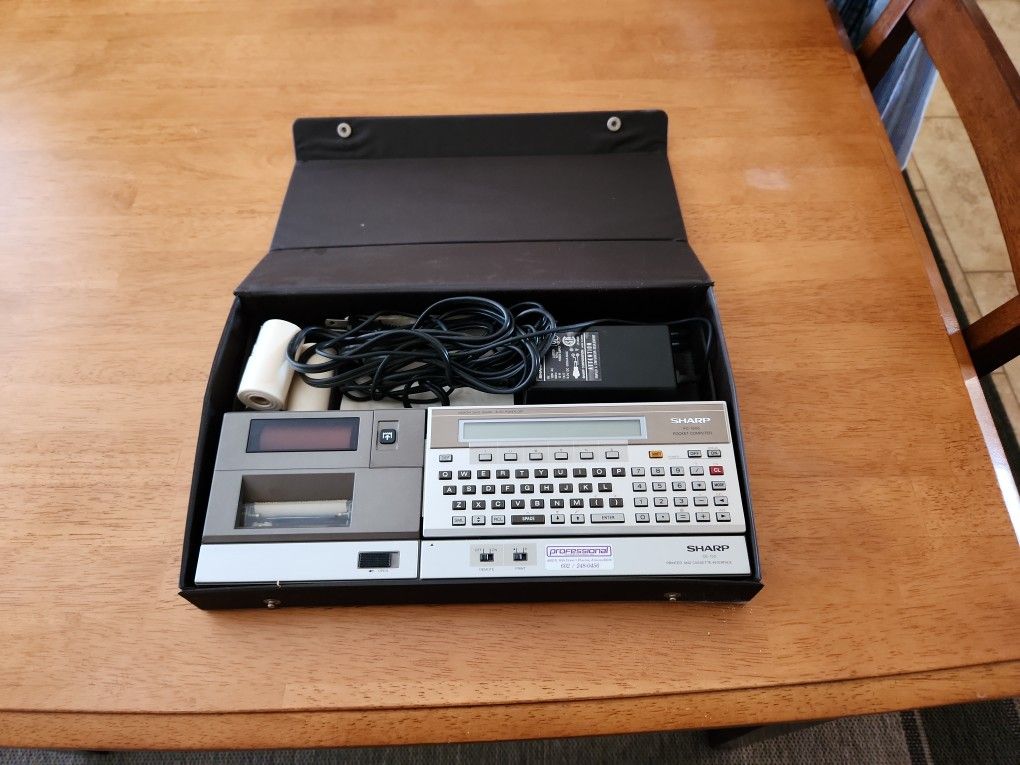 This vintage Sharp PC-1500 is an 8-bit pocket computer, originally released in 1981 in Japan and worldwide in 1982. It is programmable in BASIC and features a QWERTY keyboard, numeric keypad, and a 26-character LCD display. The CE-150 unit serves as both a 4-color plotter and a cassette interface for data storage, allowing programs to be saved and loaded from cassette tape. This item has been tested and is in good working condition. Very rare find! Great piece of computer history!