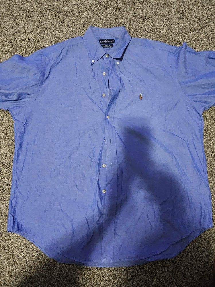 Classic Ralph Lauren Yarmouth men’s long sleeve button-down shirt in solid blue. Made from 100% cotton pinpoint oxford fabric with embroidered polo logo. Size: 17 / 35 (neck/sleeve) Style: Yarmouth Material: Cotton Oxford Condition: Good pre-owned (wrinkled from storage, steams out) Perfect for office, dress, business casual, or layering.