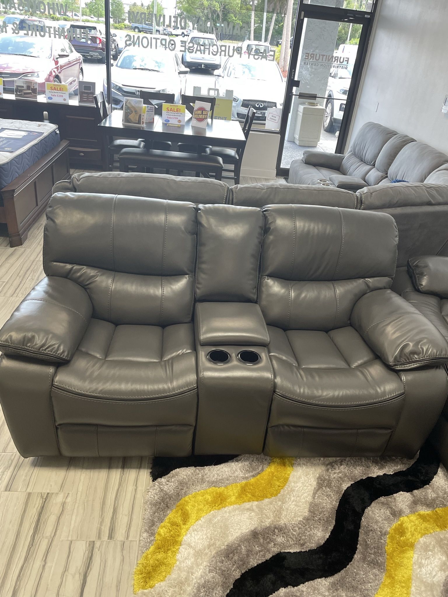 Holiday sale. Madrid, gray leather reclining sofa and loveseat set only $1199. Easy finance option. Same-day delivery.