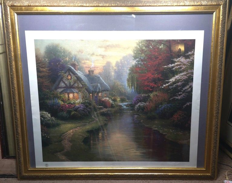 A Quiet Evening from the series of The Places in the Heart I Thomas Kincade Painter of the Light Stamp! And Signed above the Edition number WHICH IS 938/3850-I Also there is an inscription: THOMAS KINKADE JOHN 3:16 Gold gilt WOODEN frame and behind the glass. Since it's Big and heavy shipping is going to be expensive.