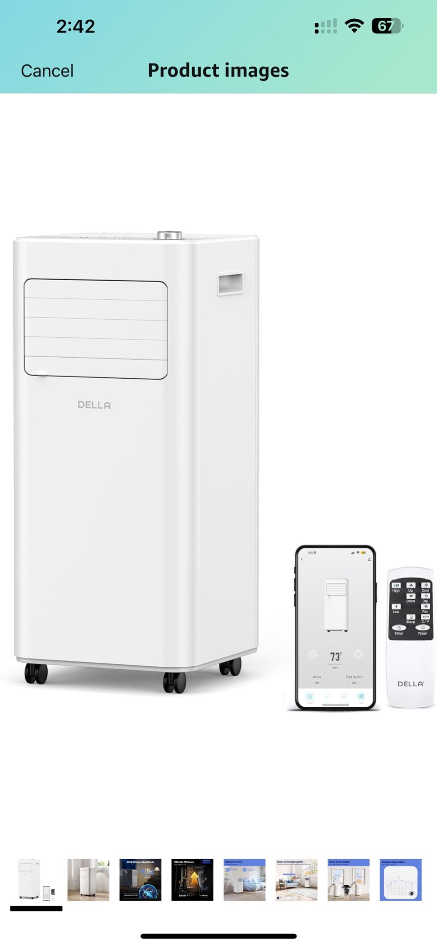 Mint condition! Smart WiFi Portable AC by DELLA, 8000 BTU, Cools Up To 150 Sq. Ft. Modes: Cooling Dehumidification Ventilation Sleep mode | GMCC compressor for lower noise levels | LED display with remote control | Built-in Handles | Strong winds and 3 fan speeds | 24-hour timer | Water-full indicator | Child lock function | ABS Frosted plastic | High Loading quantity | WiFi function